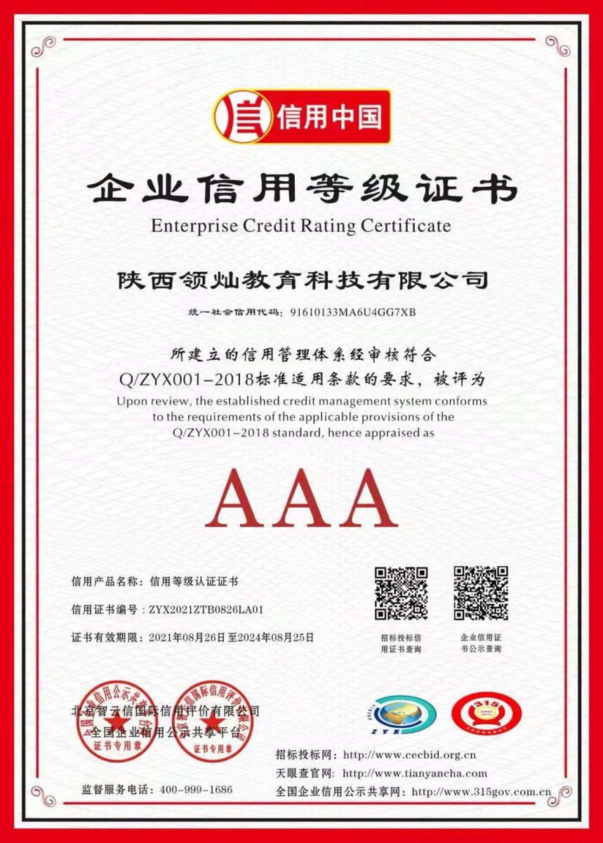 AAA企业信用等级证书